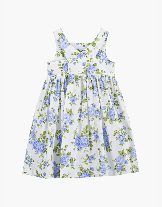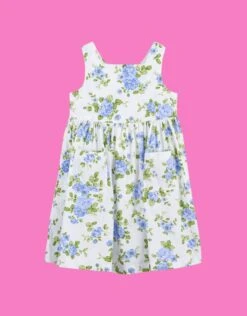 Emulating a sunny rose garden, the Adelina dress is bursting with fresh blooms all-over. The playful silhouette is sleeveless with a pleated skirt that boasts pockets for their tiny treasures of the day. Finished with crossover back straps for support.
