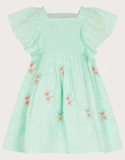 Crafted with cotton, it fastens on the reverse with buttons. Sizing in-line with Trotters – due to the smocked bodice, we recommend purchasing one size up. Blue